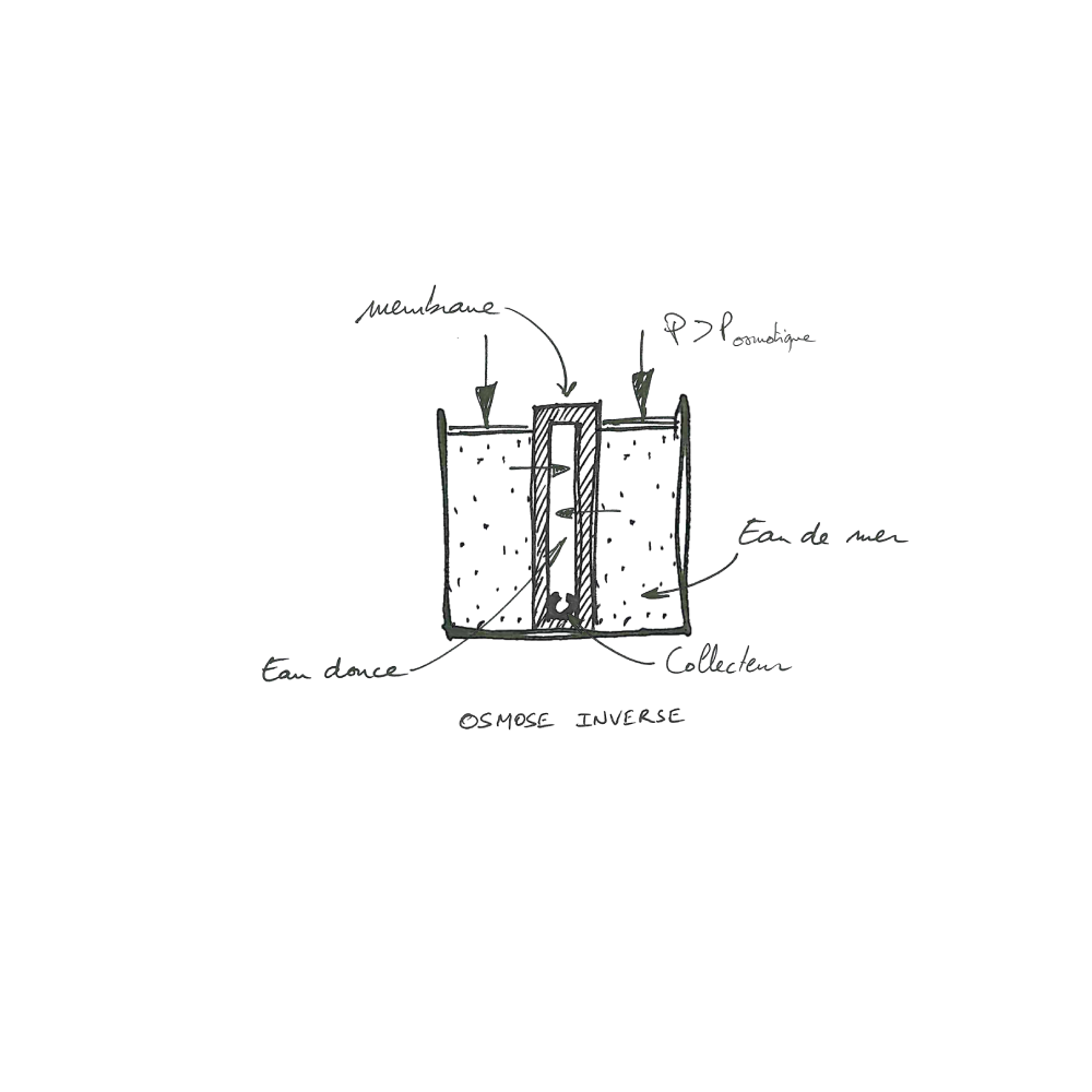 Dans cette configuration, pour produire 215 L/h d’eau douce, environ 7m² de membrane sont nécessaires. L’encombrement d’une telle installation engendrerait donc un certain nombre de problèmes.