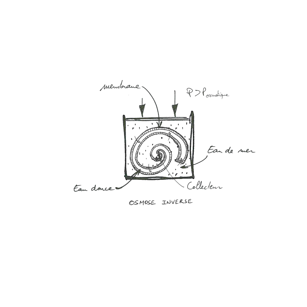 Pour continuer l’optimisation, la membrane est enroulée autour d’un collecteur d’eau douce, le tout formant une spirale.