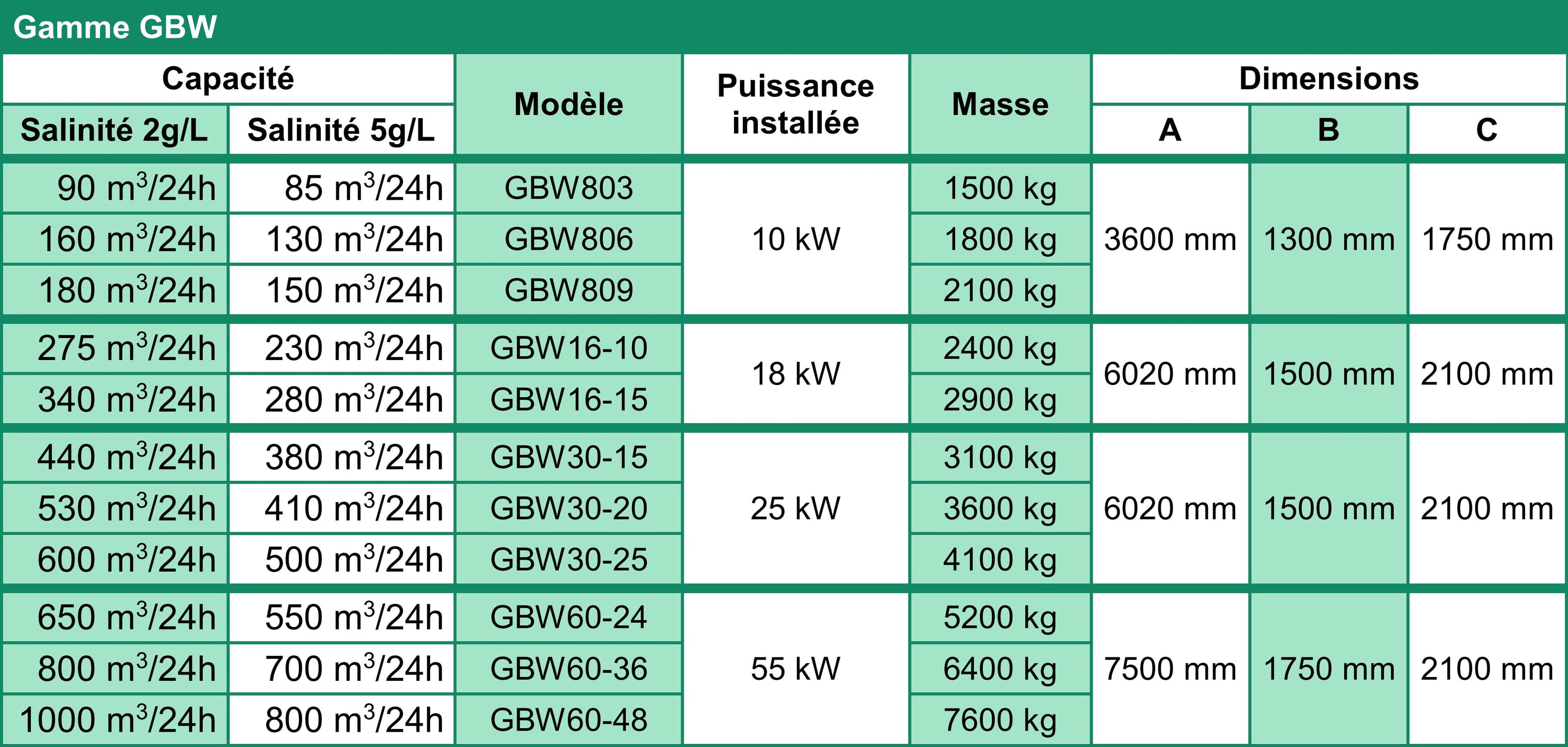 Capacité donnée à +/-10% à partir d'une eau saumâtre à 25°C et la salinité spécifiée.