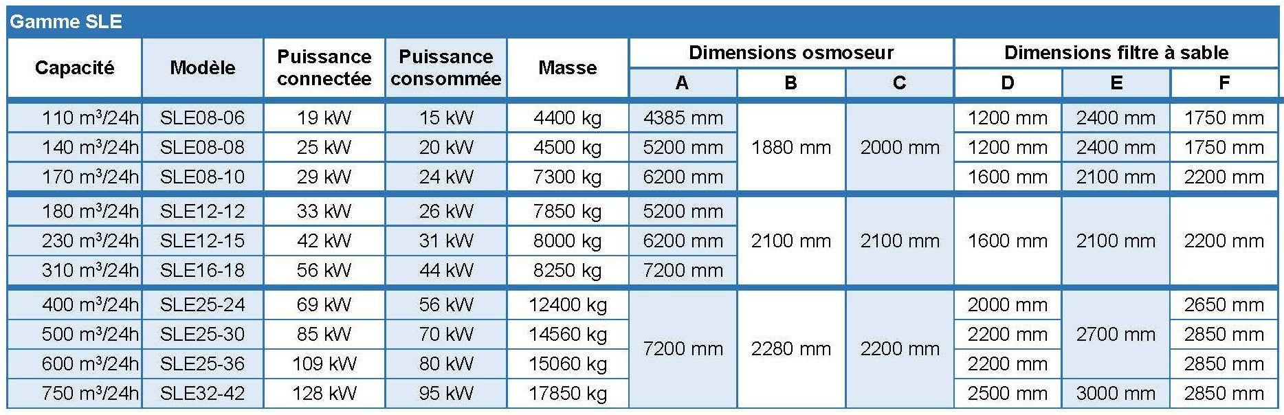 Economie d’énergie : consommation électrique inférieure à 3kWh/m³, selon les conditions d’utilisation. Accessibilité : maintenance facilitée. Les équipements standard fournis avec un osmoseur SLE sont :