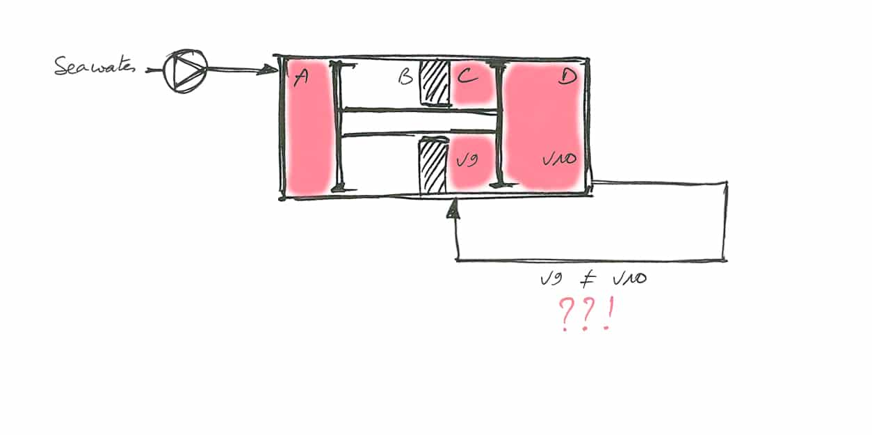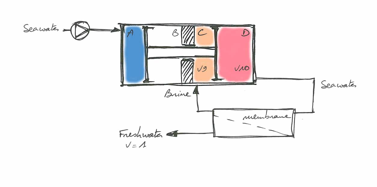 The membrane thus produces 1 volume of fresh water, the remaining 9 volumes are transferred into chamber C.
