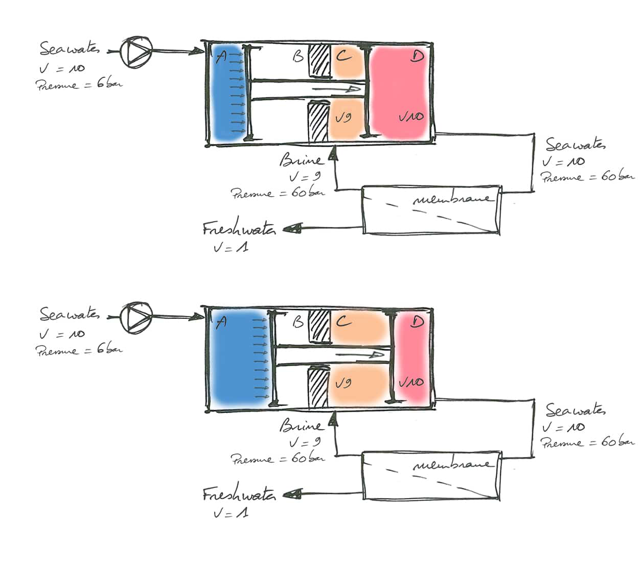- After several cycles, the reject of the membrane feeds chamber C at a pressure of 60bar on an a section of 9. That is to say an overall force of 9 × 60 = 540