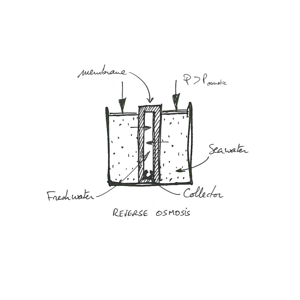 In order to reduce the size of the installation, the membrane is folded and glued to the edges so as to form a pocket in which fresh water is collected. Thanks to this configuration, the size of the installation drops to 3.5m². Although more compact, this configuration can be further improved.