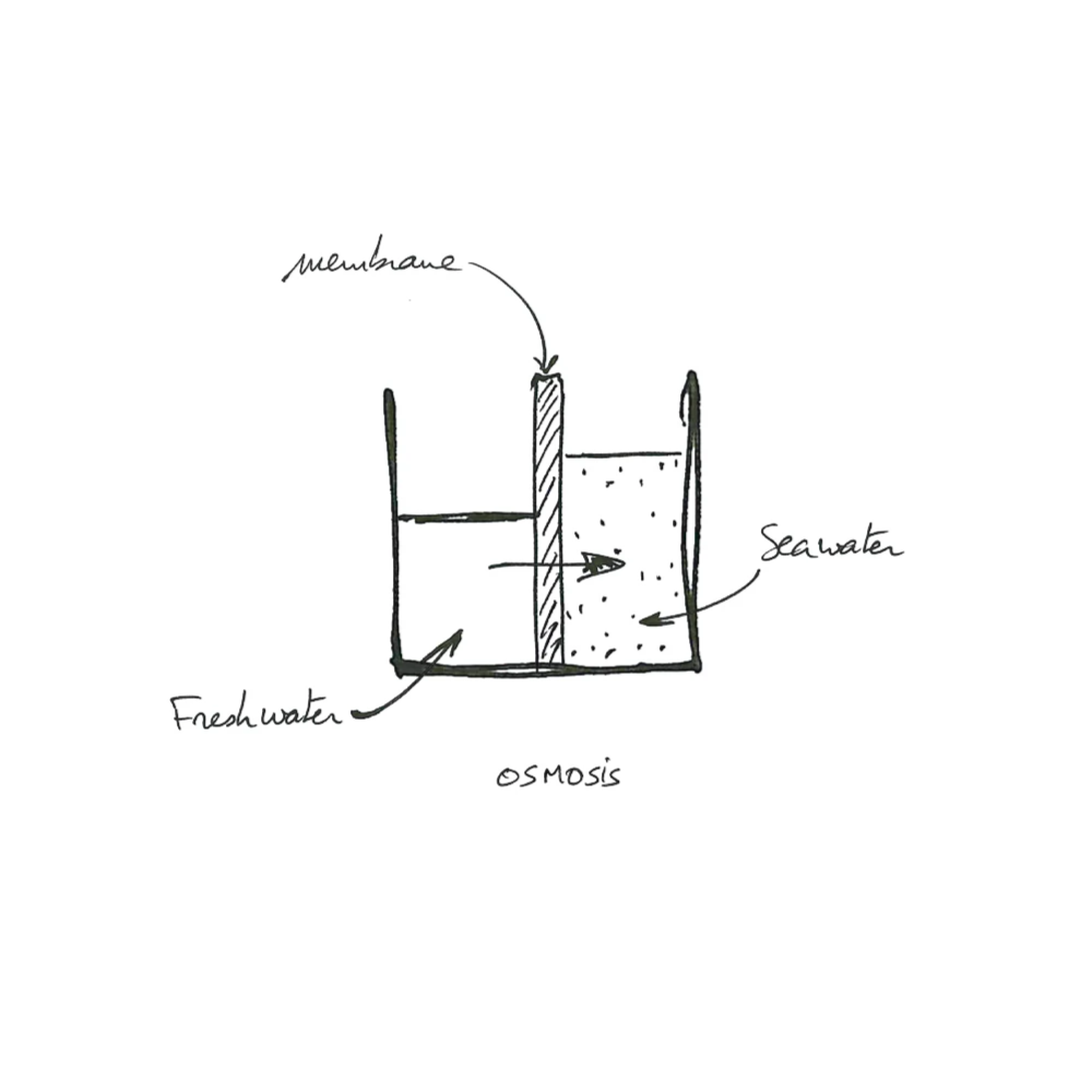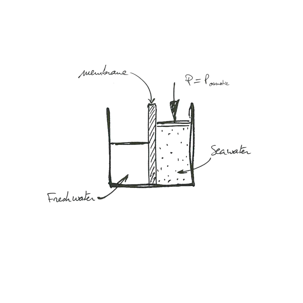 With no external intervention, a freshwater flow passes through the membrane from the freshwater compartment to the seawater compartment.